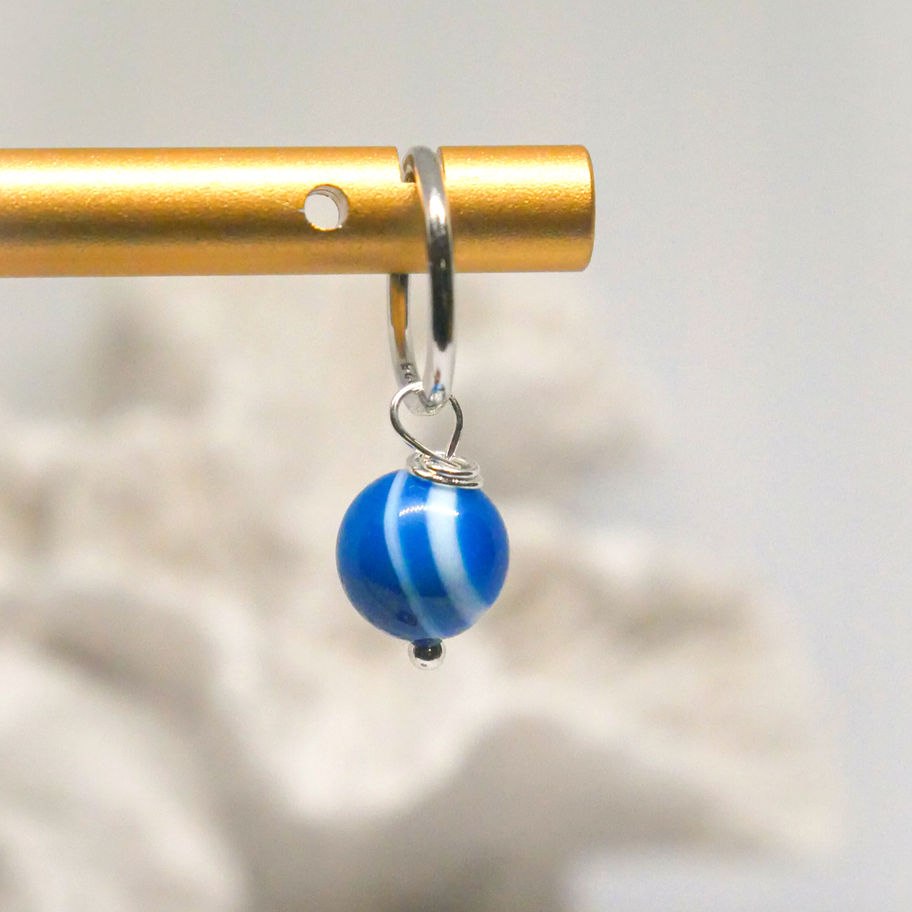 Timeless with a distinctive twist, these silver hoop earrings feature a smooth blue banded agate ball suspended from each hoop. The natural banding creates subtle pattern and depth, making each pair beautifully unique while keeping the overall look clean and minimalist.