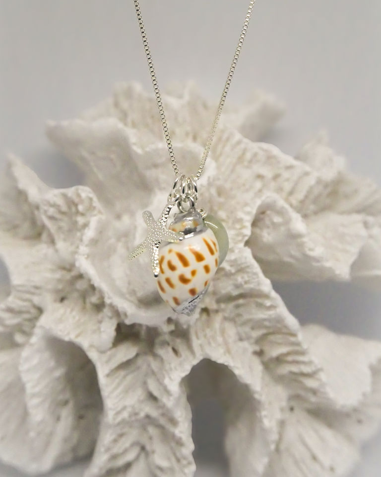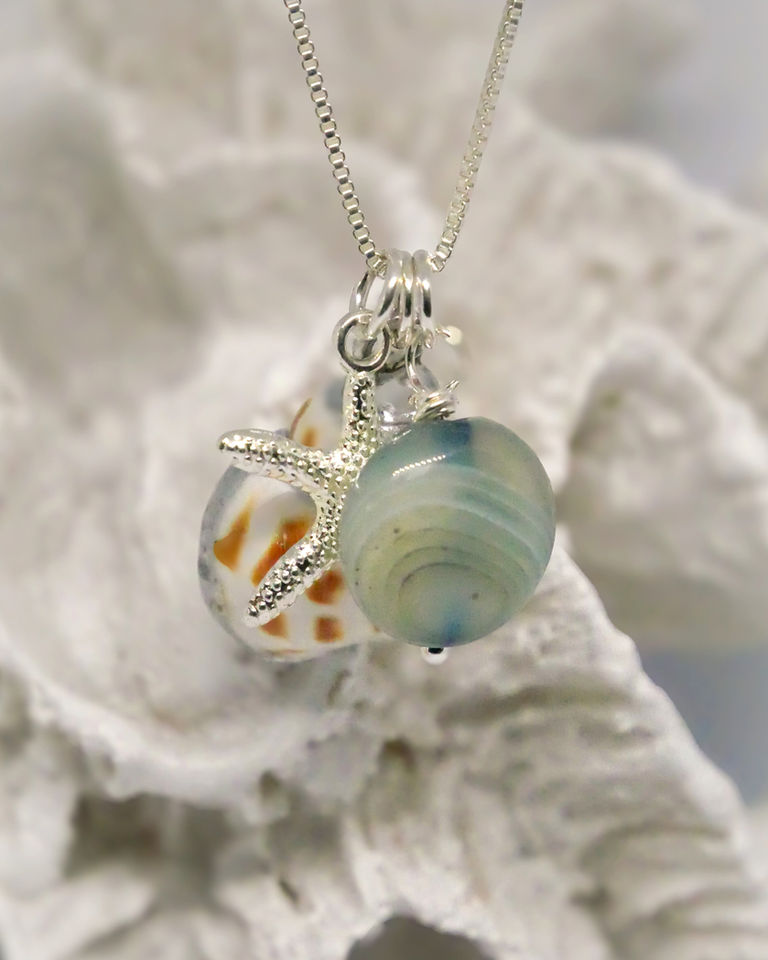 Embrace the tranquil essence of the sea with this captivating necklace — a harmonious blend of natural textures and ocean-inspired charm. A deep blue sodalite bead, delicately wrapped in silver, rests alongside a gleaming natural shell edged in silver and a silver-plated starfish charm, each element reflecting the beauty of the shore. Suspended from an 18-inch sterling silver chain, this piece radiates understated sophistication and a connection to nature’s calm.