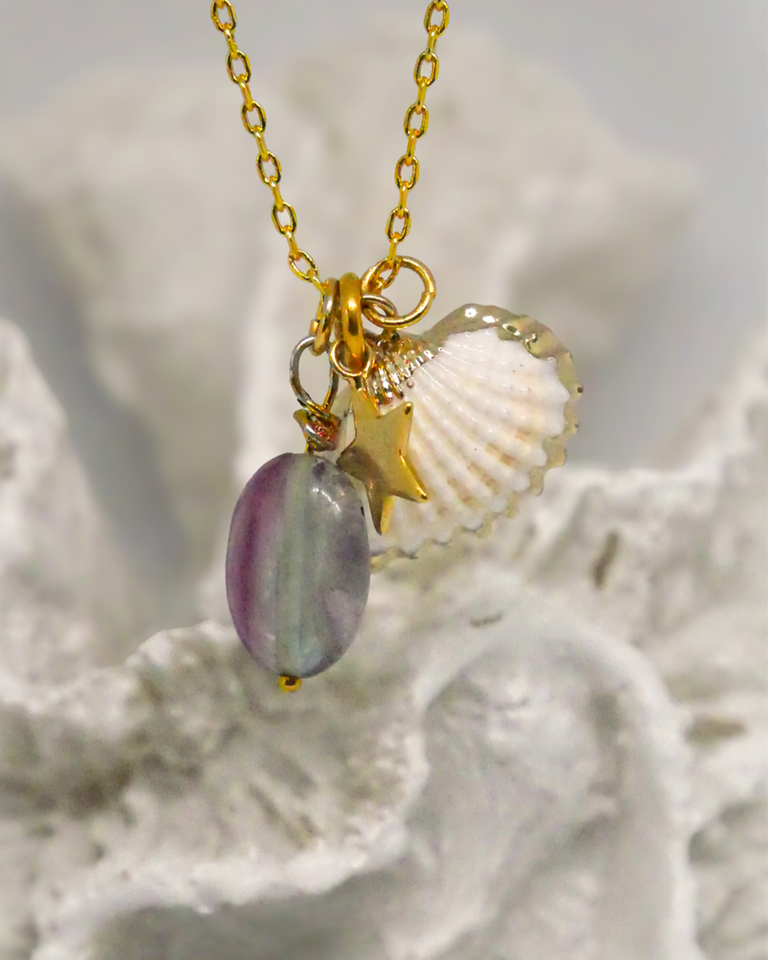 Combines natural stones, shell, and gold-plated accents for a unique coastal design