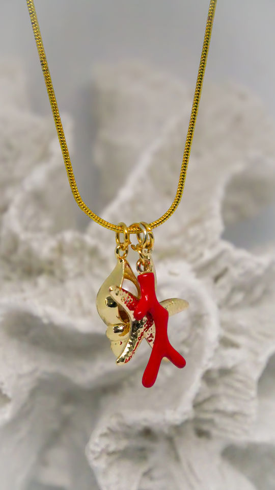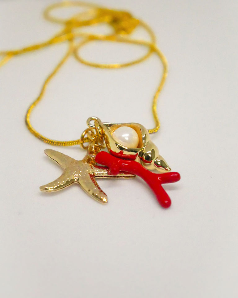 Let the spirit of the sea adorn you with this enchanting necklace, a celebration of coastal beauty and timeless charm. Featuring a faux pearl charm, vibrant coral detail, and gold-filled starfish and conch shell charms, each element is thoughtfully composed to capture the magic of the ocean. Suspended from an 18-inch gold-filled chain, this piece embodies effortless elegance — perfect for those who carry a love of the shore wherever they go.