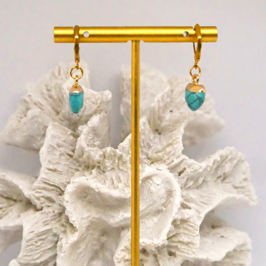 Delicate and charming, these earrings feature vibrant blue turquoise hearts set against gold-tone plated brass, creating a perfect balance of natural beauty and refined elegance. Handcrafted with attention to detail, their compact size (12.5mm x 9.75mm x 5.34mm) makes them ideal for subtle everyday sophistication or layering with other favourites. Each pair reflects the artistry of timeless design and careful craftsmanship.